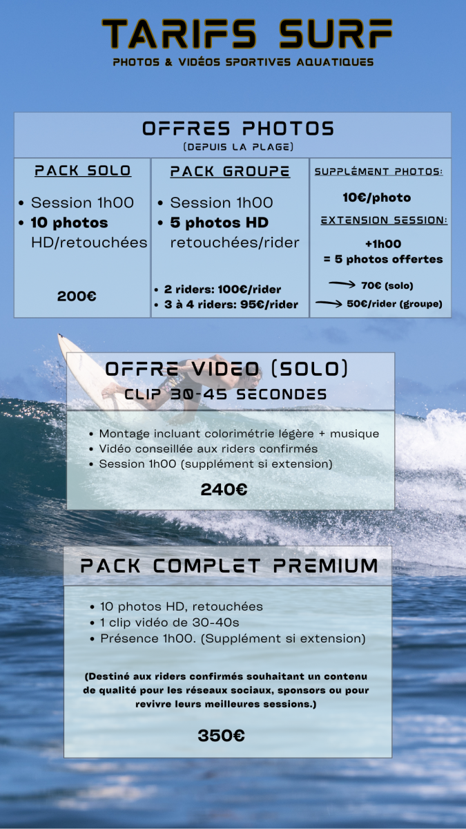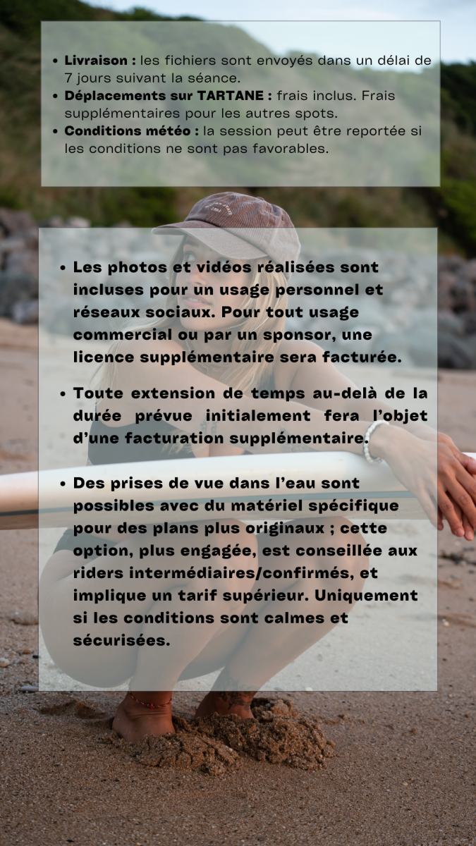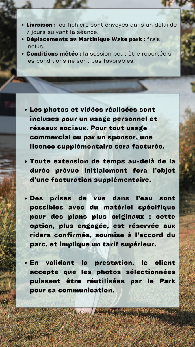 • Si le client souhaite obtenir les fichiers au format RAW, un supplément sera demandé par photo ou par lot en fonction du tarif décidé par le photographe.