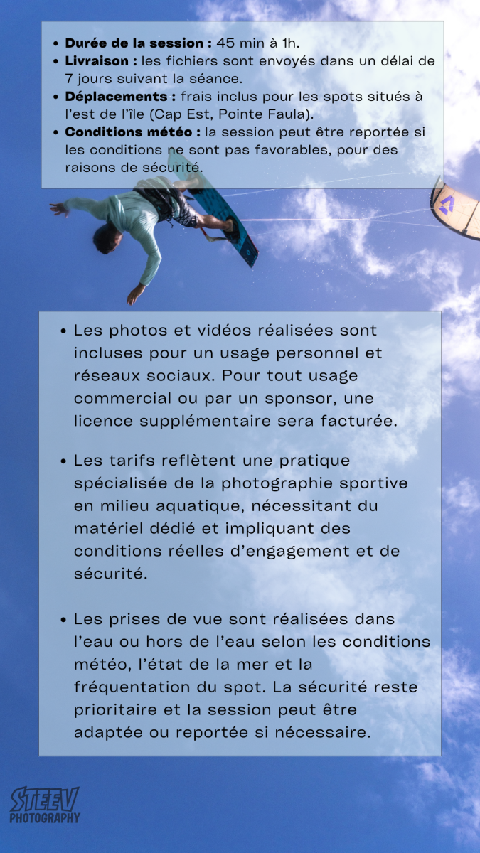 • En acceptant la prestation, le client autorise le photographe à utiliser les images pour son portfolio, son site web ou ses réseaux sociaux, sauf mention contraire écrite.